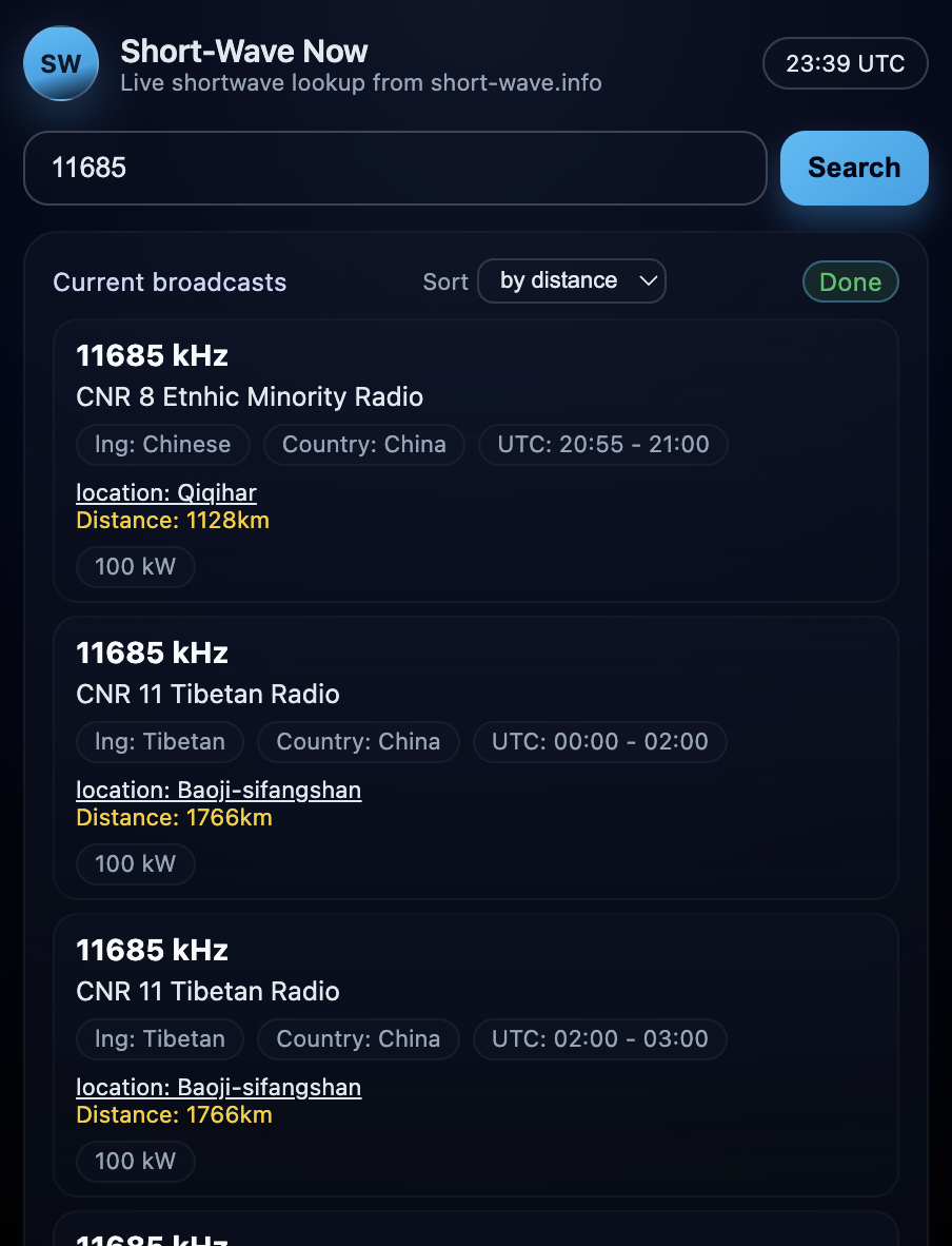 It finds shortwave broadcasts that are currently on the air by frequency from short-wave.info and shows them.